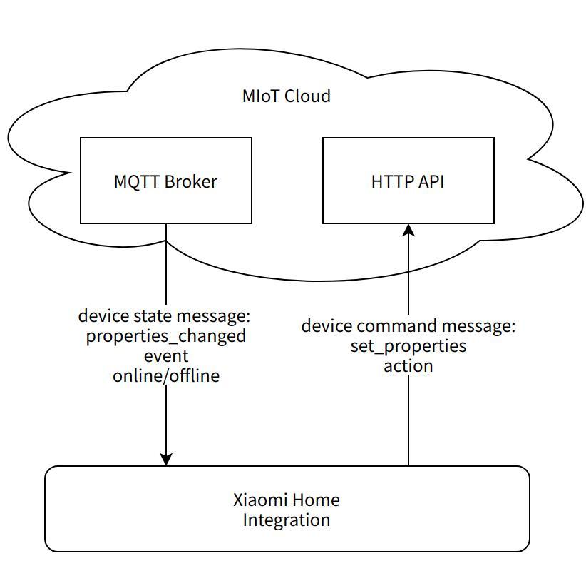 Xiaomi Home Integration sends command messages to the devices via the HTTP interface of MIoT Cloud to control devices. The device reacts and responds after receiving the downstream message sent forward by MIoT Cloud.